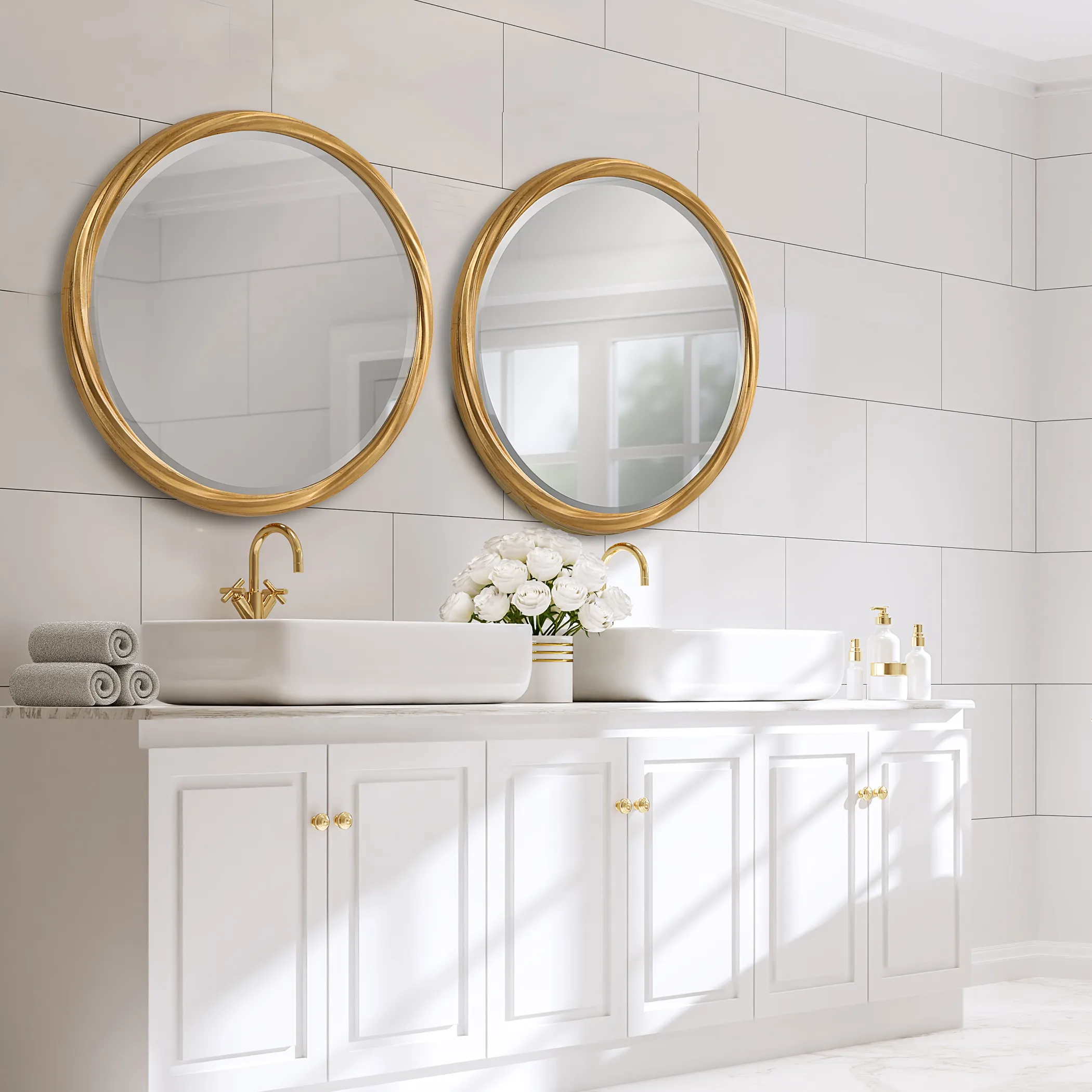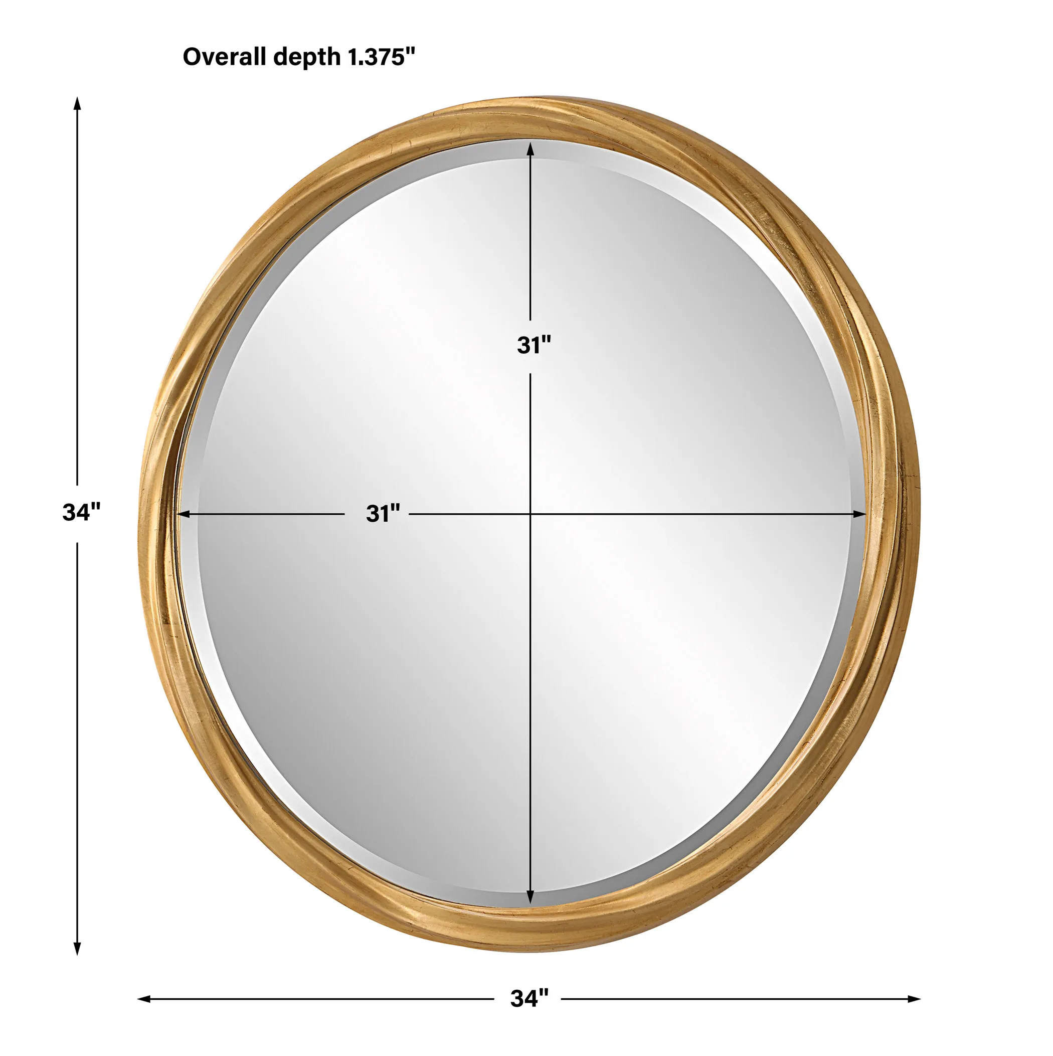 This 34" round contemporary design features a twisted profile and is finished in a gold leaf. The mirror has a 1" bevel.
