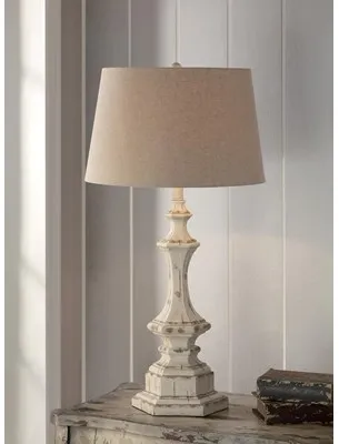 Wooden Column Table Lamp 34"Ht.,Resin White Wash Finish 14x17x11 Natural Linen Shade