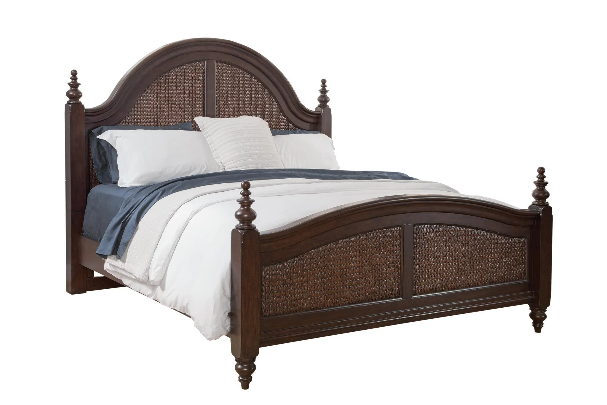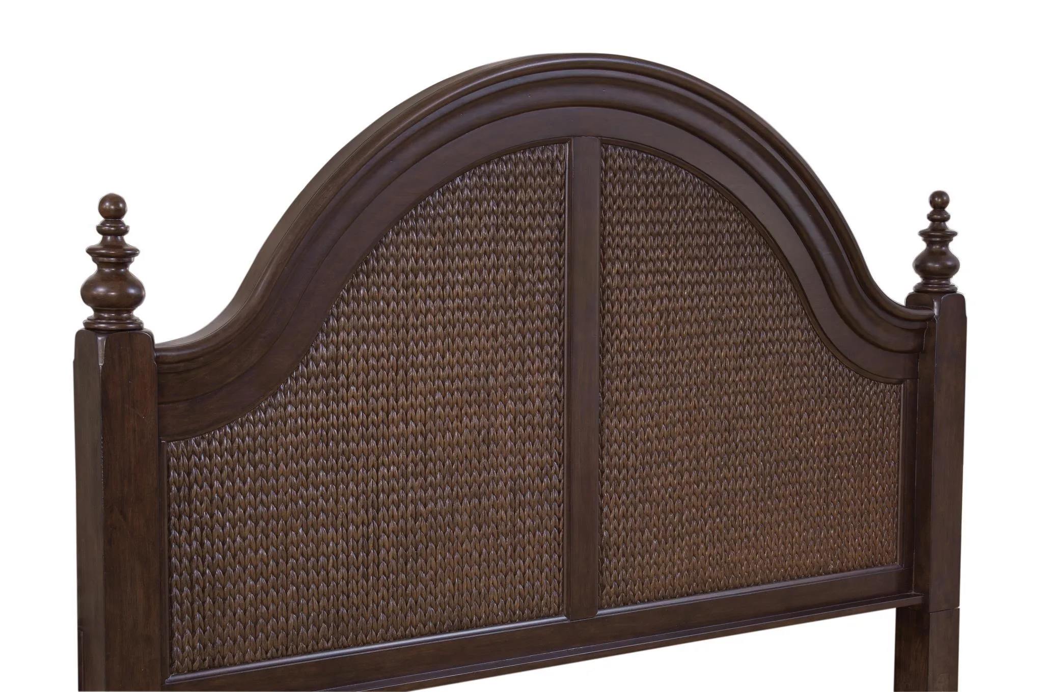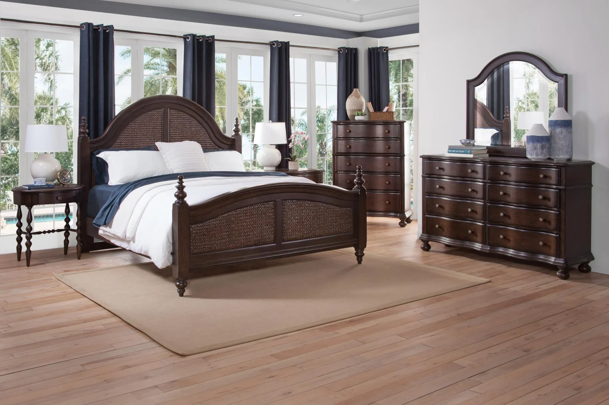 Combining tropical, vintage and organic influences with a British West Indies feel, the Rodanthe Bedroom is inspired by nature and island locales. Rodanthe is crafted of cherry veneers with a rich Tobacco finish and accented by woven banana leaf on the Queen and King beds and mirror. An expansion of the popular 3910 Rodanthe that features a cottage-flavored Dove White finish, the new look for Rodanthe offers a more tropical and vintage aesthetic that makes it versatile for spaces from a small condo to a resort villa to a master suite in any home. The Master Bedroom pieces include Queen and King woven beds and Queen and King panel beds, dresser, landscape mirror, chest, nightstand, bachelor chest and an accent table. Cherry-finished, wooden knob hardware with woven textured bronzed metal inserts add a designer touch to the collection. Mixable in containers with the current white collection, Rodanthe offers an opportunity to diversify and fill containers easily, and will be warehoused in American Woodcrafter’s High Point distribution facility for quick-ship ability.