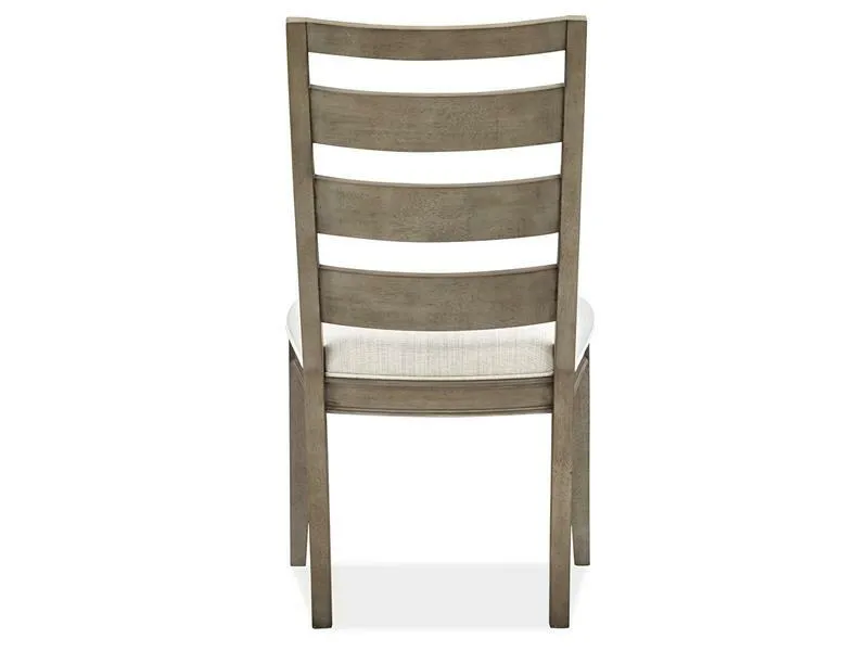 - upholstered seat and ladder wood back.