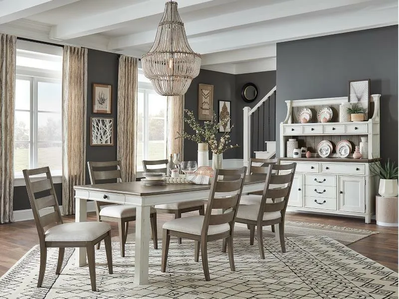 From the moment you see the Bellevue Manor dining collection, you'll be captivated by its timeless charm and vintage details. A fresh, lightly distressed Weathered Shutter white finish highlights its classic silhouettes and is paired with a warm brown Bisque finish on contrasting wood tops and paneled backs on the huntboard and hutch. Antique Bronze hardware and metal accents in the Latch Black add depth and interest. An extremely versatile and functional piece collection includes a farmhouse-style rectangular dining table that can be extended to 90W with one center leaf and a drop-leaf dining table with metal accents around the legs and metal stretchers. The drop-leaf table has a square top that can be extended to a 54-inch round top with four side demilune drop leaves. Rounding out the dining selections is a charming and versatile rectangular pub table that can also be used as an island. The top can be extended to 58W when a 16-inch butterfly leaf is used. There are two wood doors on the front with one adjustable removable reversible wine storage shelf behind the doors. A grand buffet with hutch features a wood paneled back in the Bisque and two side by side drawers, while the buffet has five drawers with two felt-lined top drawers, two wood doors on the sides and one adjustable shelf behind each door. The server has two wood doors with two adjustable wood shelves and one half adjustable wood shelf behind the right door, while the huntboard has two fixed shelves with plate grooves. Chair choices are a side chair with upholstered seat and horizontal slat backs and wood trim in the Bisque finish, a diamond-tufted shaped armless host chair, a counter-height chair with upholstered seat and a counter-height dining bench with upholstered seat and wood back. Whether your design preference is cottage, coastal or traditional, this unique collection will beckon you home at the end of each day.
