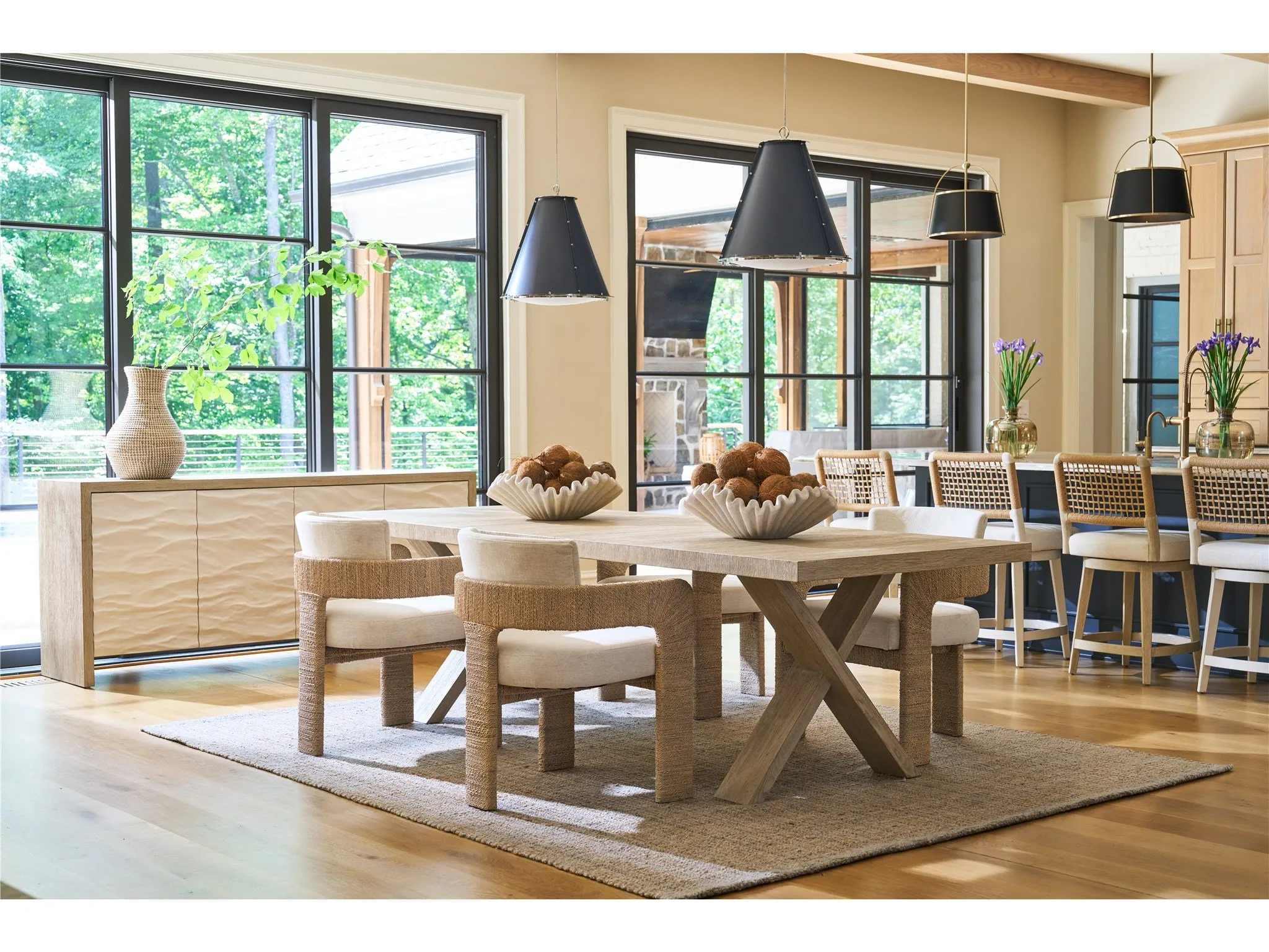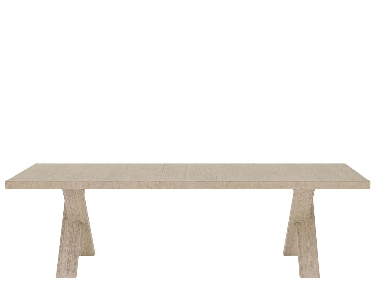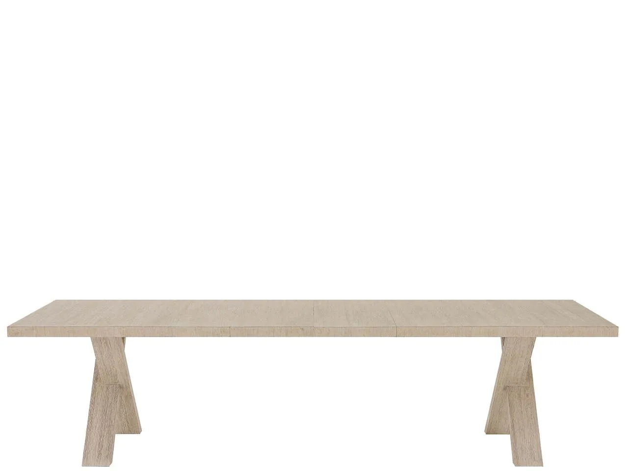 The Dockside Dining Table features a distinctive X-base. This rectangular dining table extends to 118 inches with two 16-inch leaves, creating flexible dining space perfect for both everyday meals and entertaining.