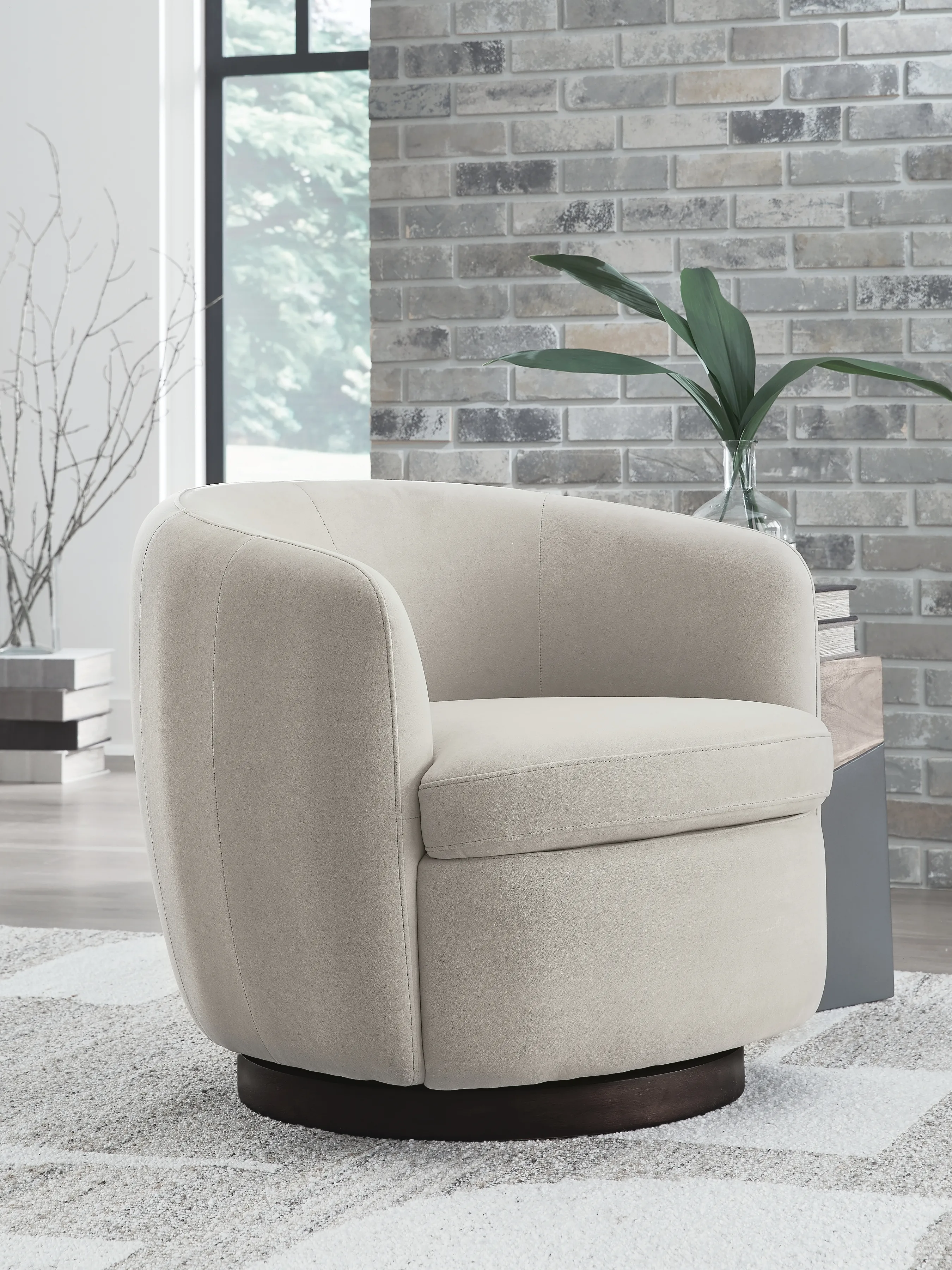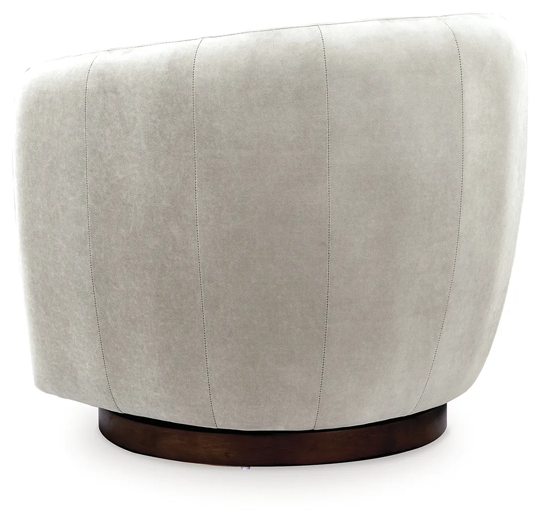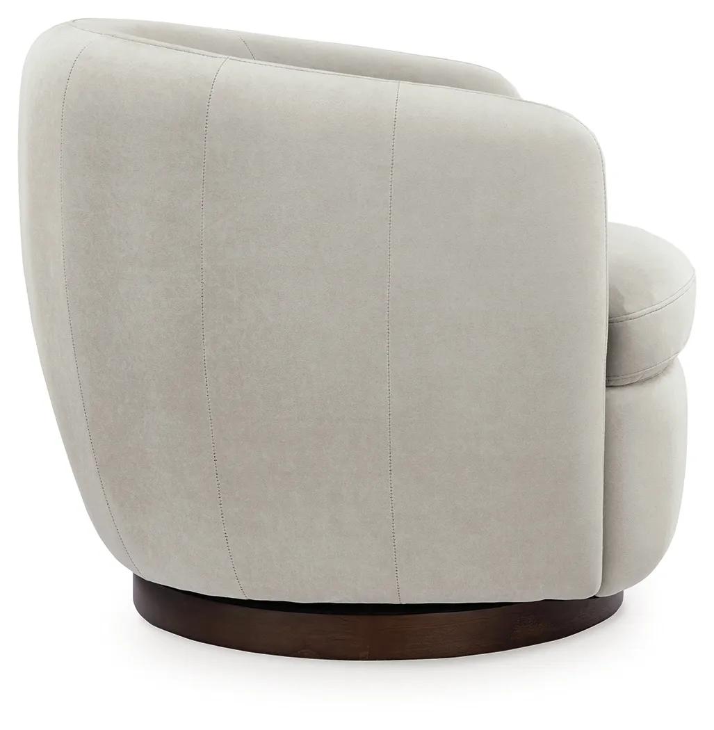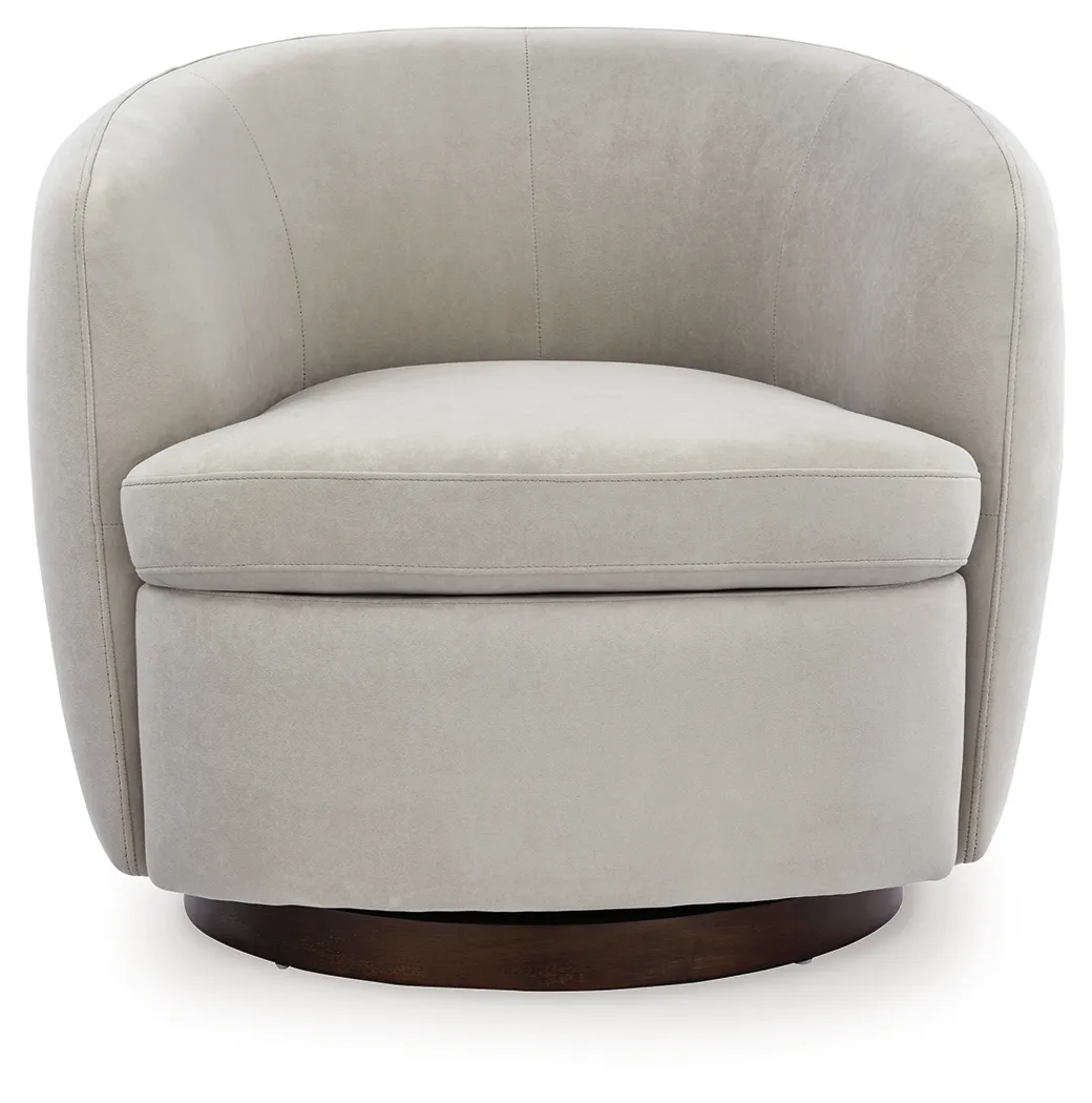 Approachable with its classic barrel design, this swivel accent chair invites stylish relaxation to the everyday. Curl up in its velvet upholstered seat—relaxing with a book or your favorite show has never been so comfortably luxurious. Completing the look, a wood swivel base provides a chic contrast to the fabric’s light neutral hue.