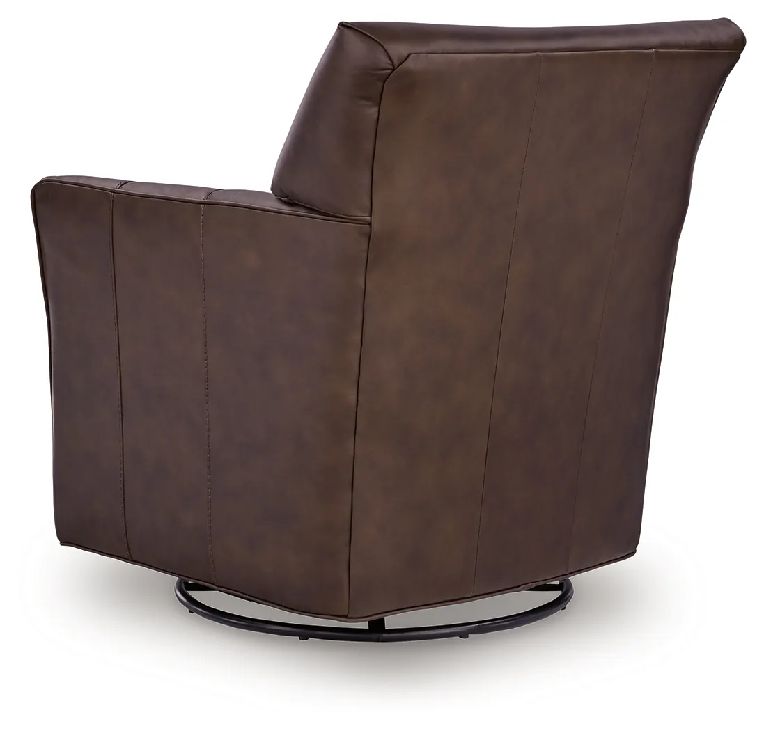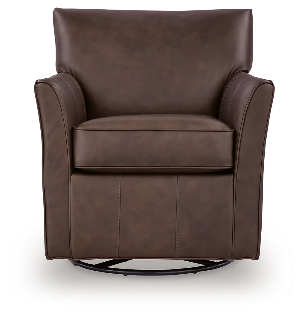 Settle into the buttery softness of this accent chair. Upholstered in a combination of rich espresso brown leather and skillfully matched faux leather, its surface is incredibly smooth to the touch, inviting you to sink in and relax. With a gentle glide and effortless swivel, this piece isn't just for sitting—it's for unwinding.