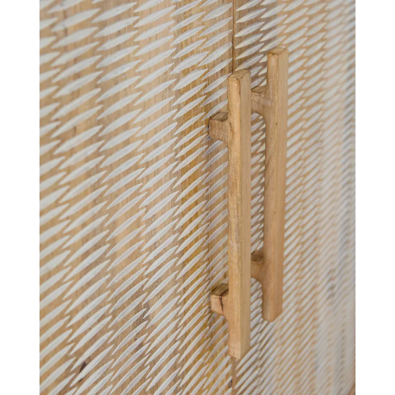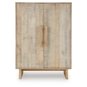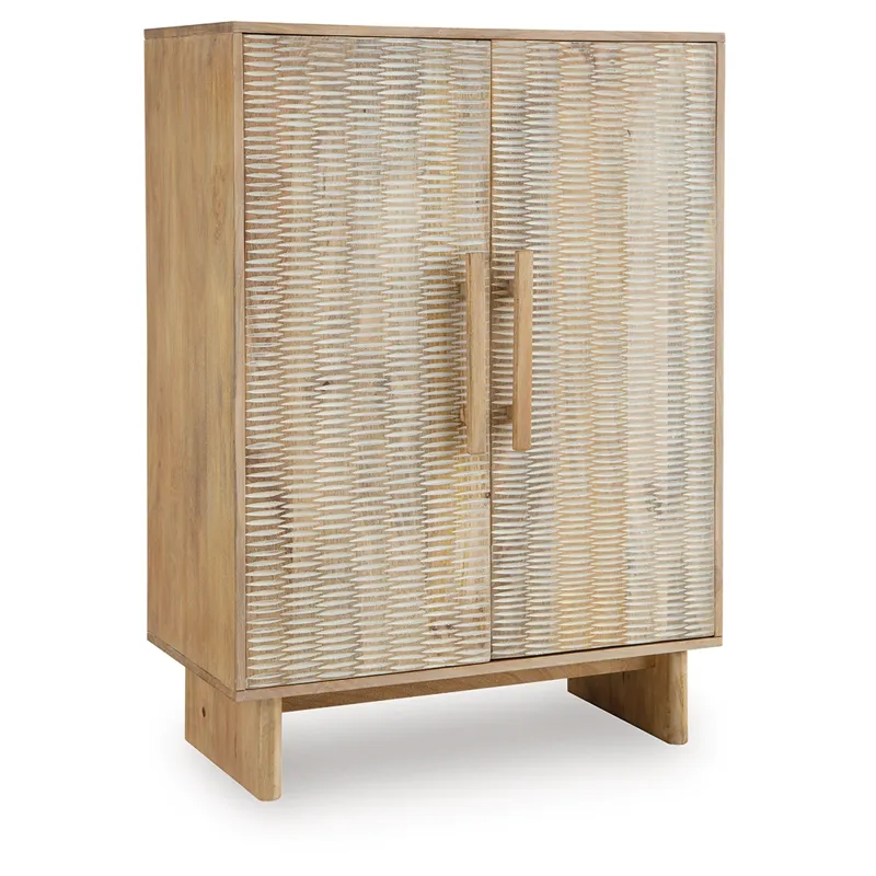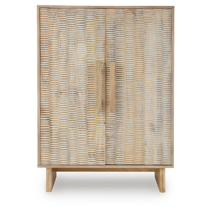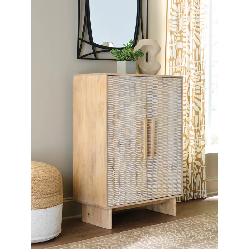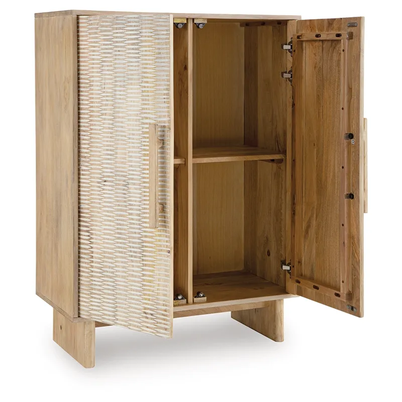If it’s coastal chic or cottage quaint style you long for, this delightful accent cabinet is sure to satisfy. Doors with a carved scoop design in a whitewash and natural finish convey an easy-breezy sensibility, perfect for a relaxed vibe. A light wire-brushed effect enhances the wood grain. Two shelves cater to your out-of-sight storage needs. What a charming complement to your casual-chic decor.
